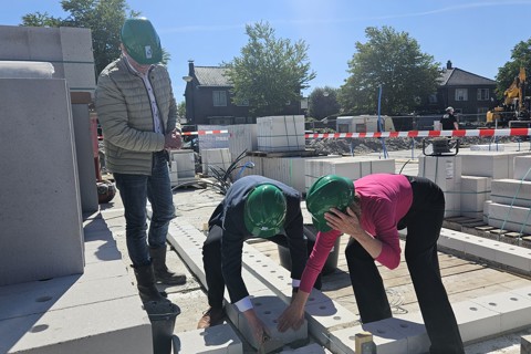 Met het plaatsen van een symbolische eerste wand is vandaag stilgestaan bij de bouw van 16 nieuwe huurwoningen aan de Loek Casperslaan in de wijk Groenpoort. Wethouder Engbert Stroobosscher, directeur-bestuurder Trees van Haarst van Veenvesters en technisch directeur Richard te Vaarwerk van Van Campen Bouwgroep verrichtten samen deze handeling. Hiermee gaat de bouw van de woningen de hoogte in.