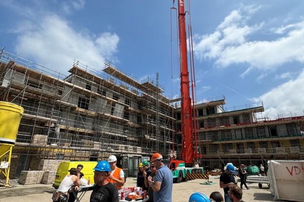 Groenpoort groeit! Op woensdag 25 juni vierden we een bijzondere mijlpaal: het hoogste punt van het nieuwe appartementengebouw aan de Bakker van Voorthuizenlaan is bereikt. Een mooi moment voor Veenvesters en ontwikkelende bouwer Dura Vermeer Bouw Midden West, die samen werken aan de bouw van 40 moderne en energiezuinige, sociale huurappartementen.