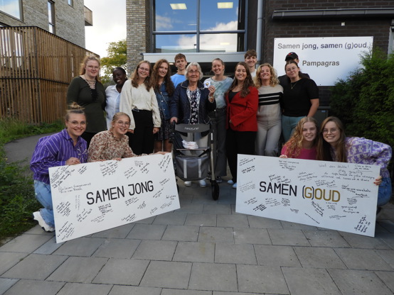 Sifra (19), Claudia (24), Thomas (19) en Tycho (20) wonen sinds dit jaar tussen de senioren, en dat is best bijzonder. Samen met hun 24 huisgenoten wonen ze aan het Pampagras, in een buurt vol ouderen. Om de buurtgenoten beter te leren kennen, organiseerden ze op Burendag (28 september) een gezellige buurtborrel in hun woongebouw.