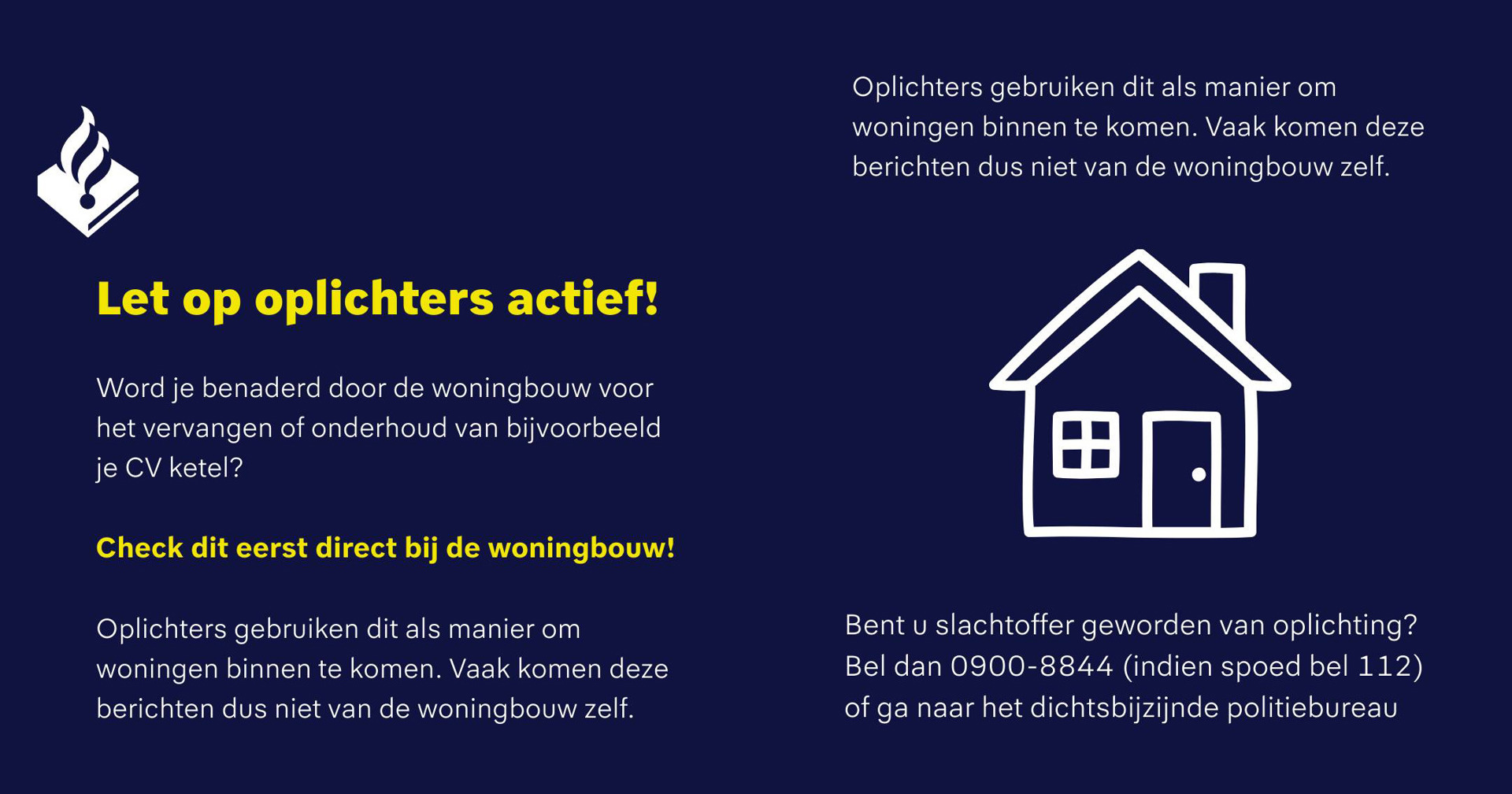 Let op: Politie Veenendaal waarschuwt voor oplichters die zeggen dat ze namens de woningcorporatie komen om bijvoorbeeld uw cv-ketel te onderhouden of te vervangen.