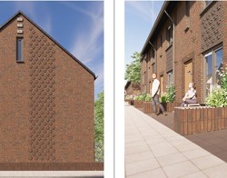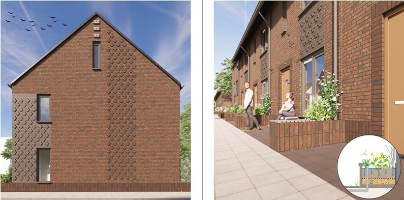 Aan de voorzijde van de woningen zijn bloembakken en een houten zitbank gemaakt om het contact tussen buren te vergroten.