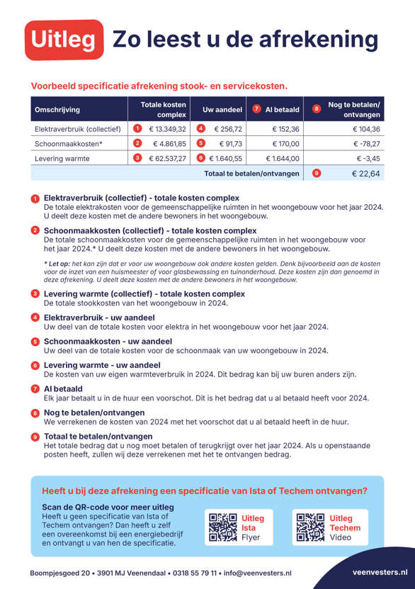 Tussen april en juli ontvangen veel huurders van Veenvesters de afrekening voor de service- en stookkosten van het afgelopen jaar. Dus over 2024. Ieder jaar maakt Veenvesters een inschatting van deze service- en/of stookkosten. Maandelijks wordt hiervoor een voorschot betaald via de huur. In de afrekening worden de betaalde voorschotten vergeleken met de werkelijke kosten. Hieruit blijkt of er een teruggave is of dat er een bijbetaling nodig is.