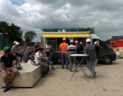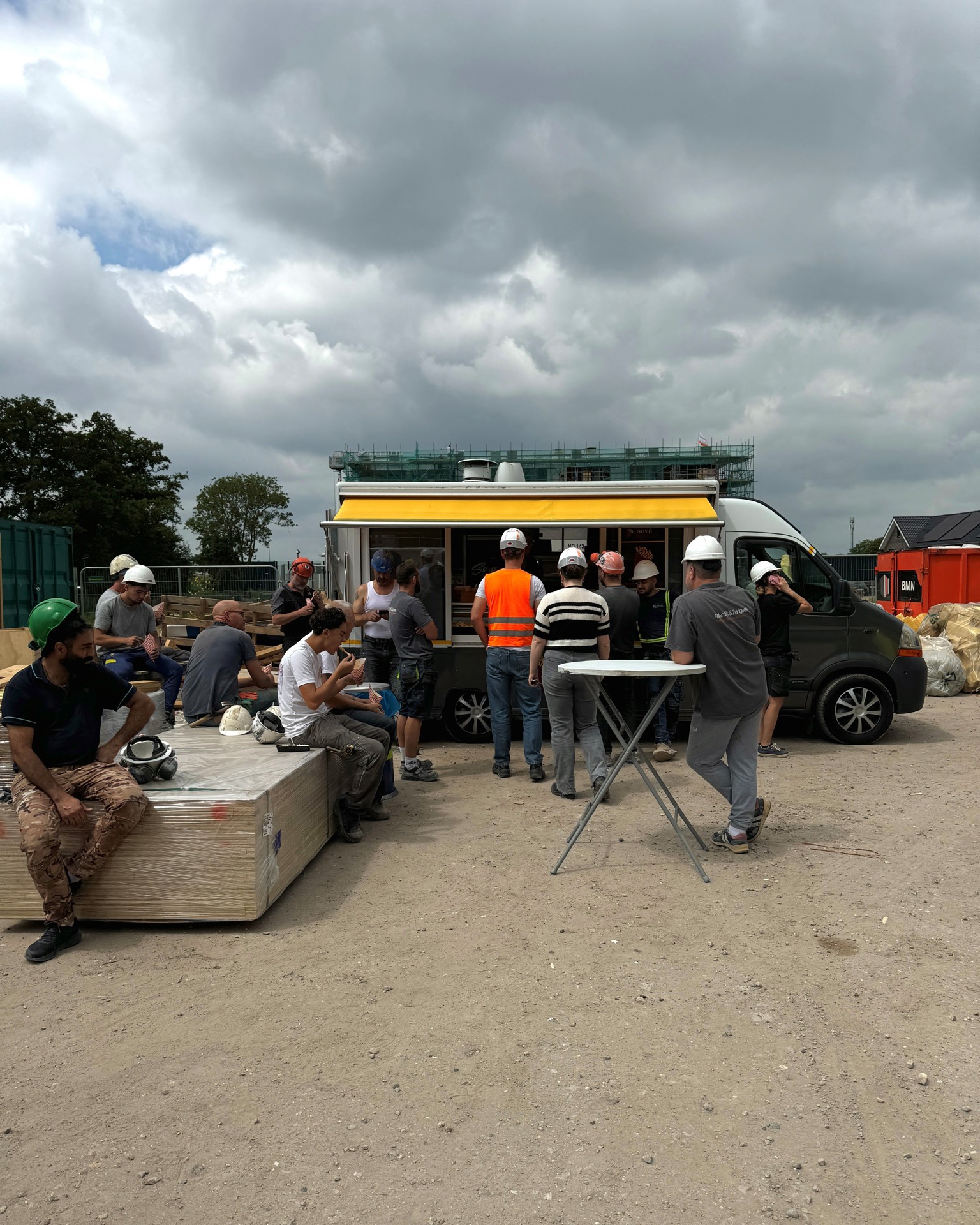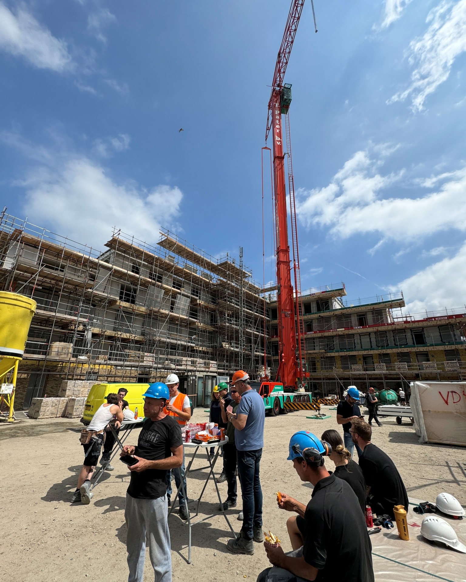 De bouw verloopt voorspoedig en naar verwachting ontvangen de eerste huurders in het voorjaar van 2026 de sleutel van hun nieuwe woning. Zoals de traditie het wil, werden de vaklieden op de bouwplaats in het zonnetje gezet bij de Hoogstepuntviering. Niet met het klassieke ‘pannenbier’, maar met een eigentijdse traktatie: (pannen)friet! Deze blijk van waardering werd goed ontvangen.