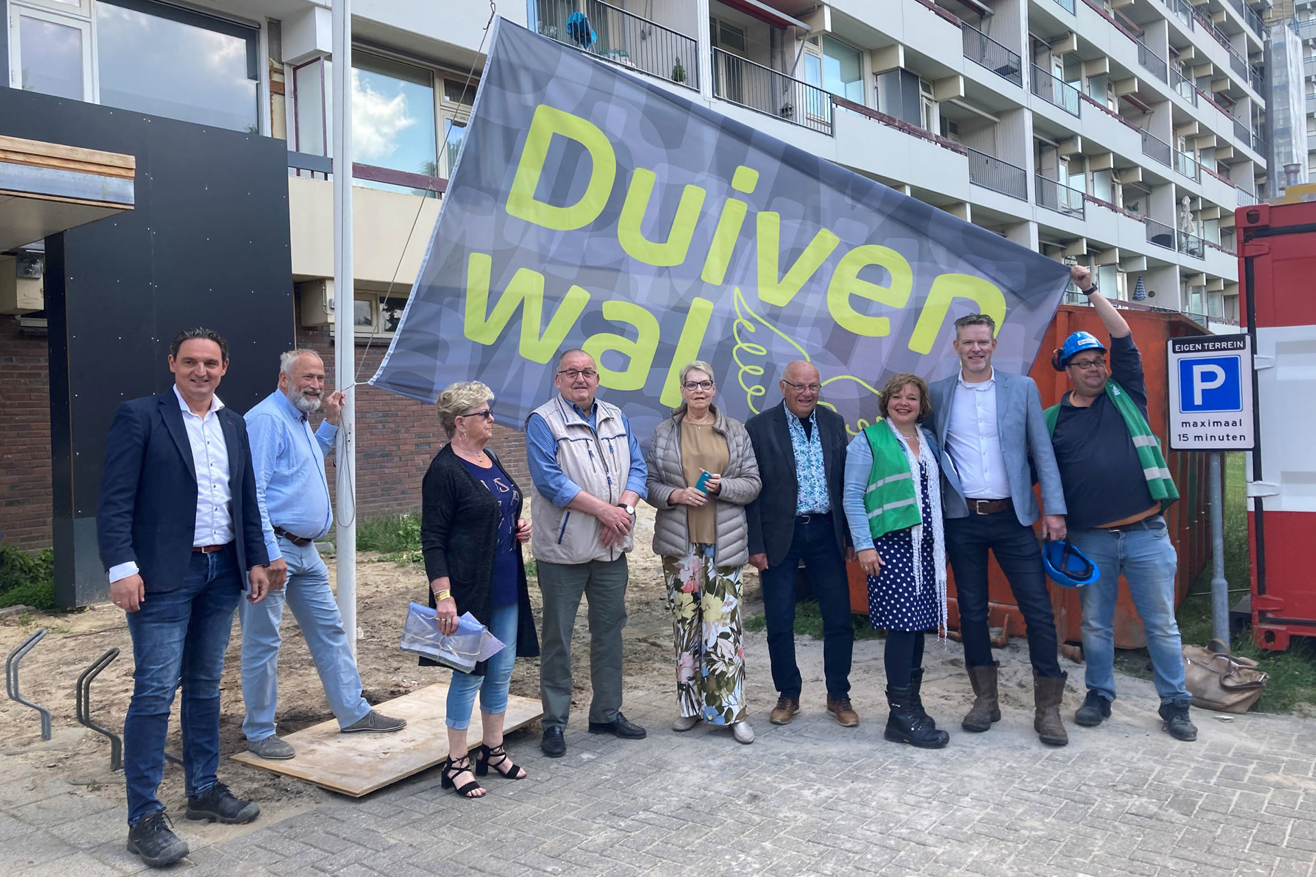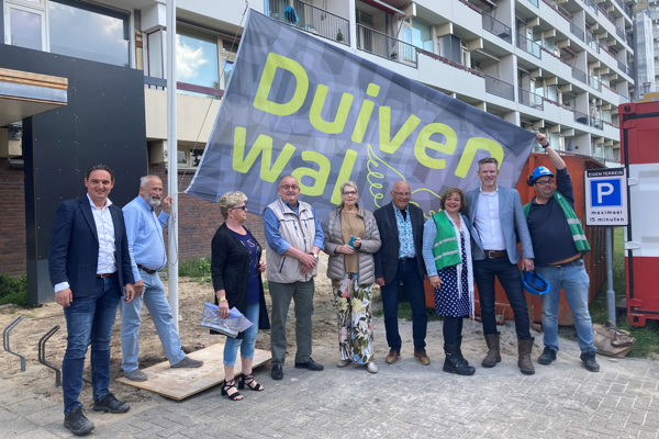 Mijlpalen zijn er om samen stil te staan bij het werk dat al is verzet en voorzichtig vooruit te blikken naar het komende eindresultaat. Ruud Eberwijn, gebiedsregisseur bij Veenvesters , Mark Bokdam, bedrijfsleider bij Van Wijnen Eibergen en Eric van der Ploeg, adjunct-directeur bij Trebbe markeerden, onder toeziend oog van de bewonerasadviesgroep en het uitvoeringsteam, deze mijlpaal met het hijsen van de Duivenwal-vlag. Deze nieuwe vlag staat symbool voor een toekomstbestendig Duivenwal waar bewoners fijn, veilig en comfortabel kunnen wonen.