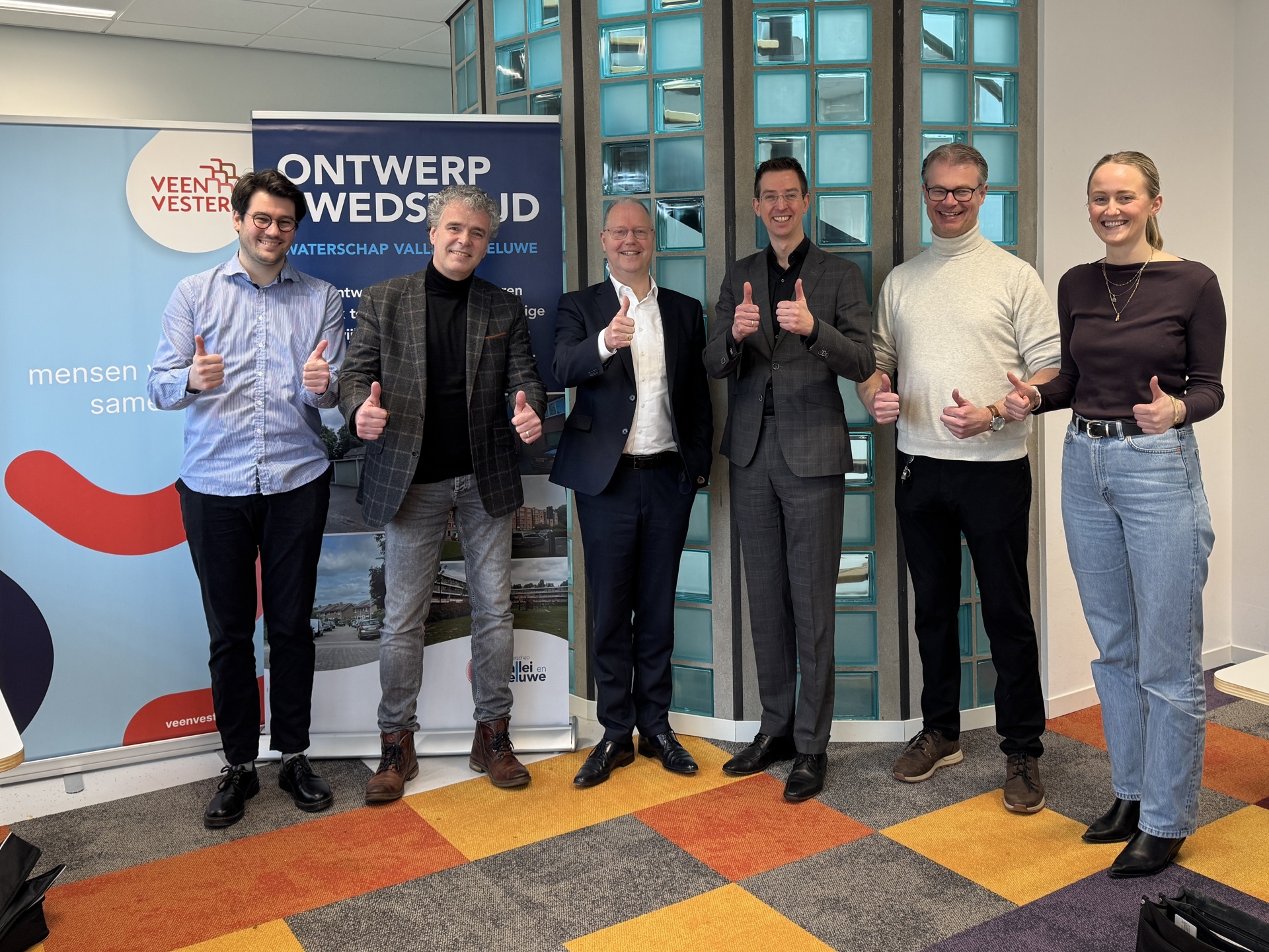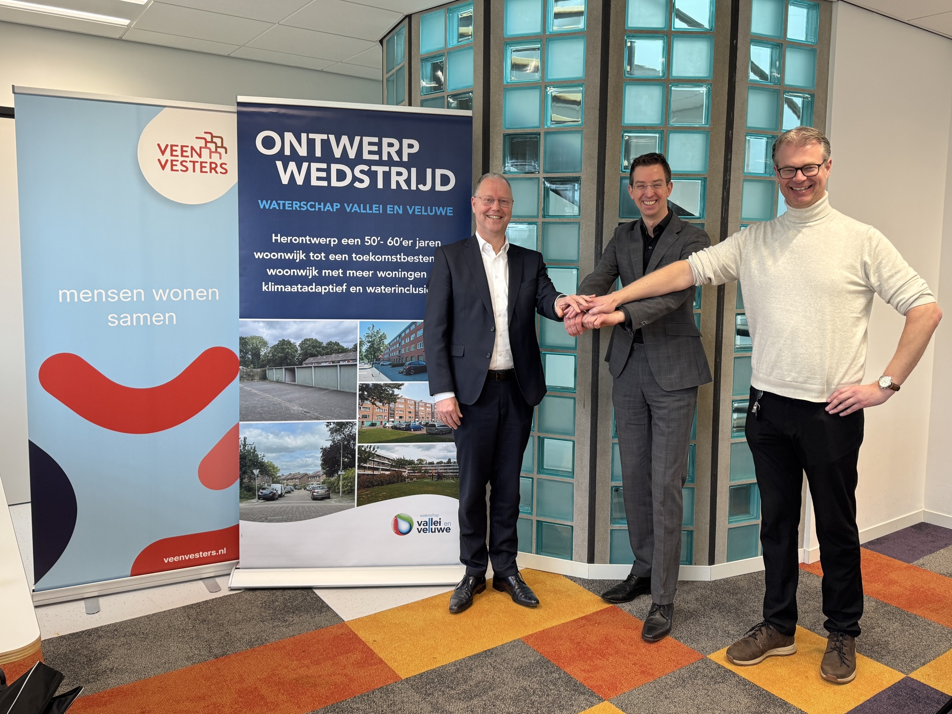 Aan tafel zaten onder andere Carlo van Dijk, heemraad van Waterschap Vallei en Veluwe, Engbert Stroobosscher, wethouder van de gemeente Veenendaal en Gosse Dousma, manager vastgoed van Veenvesters. Samen bekeken zij hoe het prijzengeld kan worden ingezet voor de uitwerking van het winnende ontwerp voor de wijk. Ook bespraken zij hoe zij daarbij samen willen werken.