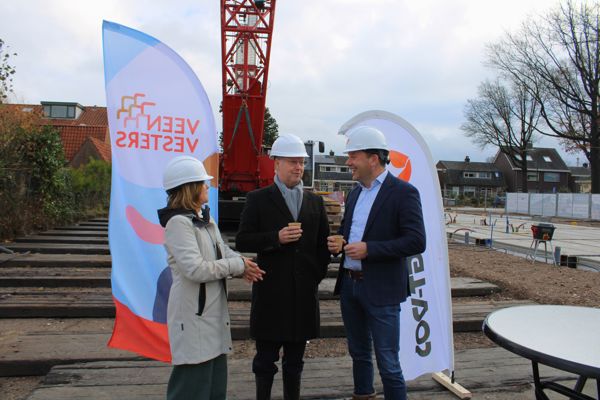 De bouw van 64 nieuwe sociale huurappartementen aan de Dennenlaan in Veenendaal heeft een belangrijke mijlpaal bereikt. Wethouder Engbert Stroobosscher, Veenvesters-directeur Trees van Haarst en Commercieel directeur Plegt-Vos Oost Jauke Klein legden vandaag samen de symbolische een vloerplaat voor de begane grond. Daarmee wordt weer een stap gezet in de bouw van deze nieuwe, duurzame woningen.