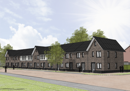 Het bovenstaande beeld is een impressie van de huurwoningen aan de Loek Casperslaan. Het uiteindelijke plan kan afwijken.